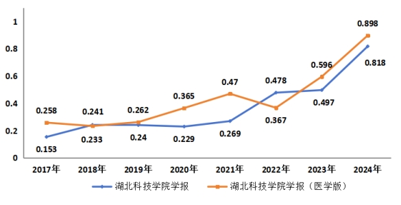 近日,中国知网发布了《中国学术期刊影响因子年报(2025版)》,由湖北省教育厅主管、我校主办的学术期刊《湖北科技学院学报》和《湖北科技学院学报(医学版)》影响因子再攀新高。数据显示,《湖北科技学院学报》复合影响因子为0.818,同比增长64.59%,相比上一个五年数据提升240.83%,影响因子学科排序263/648,位于Q2区,在省属同类地方高校中名列第一;《湖北科技学院学报(医学版)》复合影响因子为0.898,同比增长50.67%...